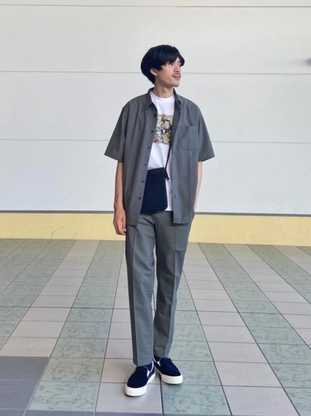 【身長】 175cm 【普段サイズ】 トップス(M) ボトムス(M) シューズ(27.0cm) 【サイズ感】 シャツ:ややゆったりめ インナー:ややゆったりめ パンツ:標準的 【素材感】 シャツ:ややシャリ感がありさらっとしている インナー: 薄手の滑らか パンツ: ややシャリ感がありさらっとしている 【着こなしポイント】 落ち着いた配色のセットアップに柄のカットソーを合わせることで、大人っぽく、かつ立体感のあるスタイリングを作りました。