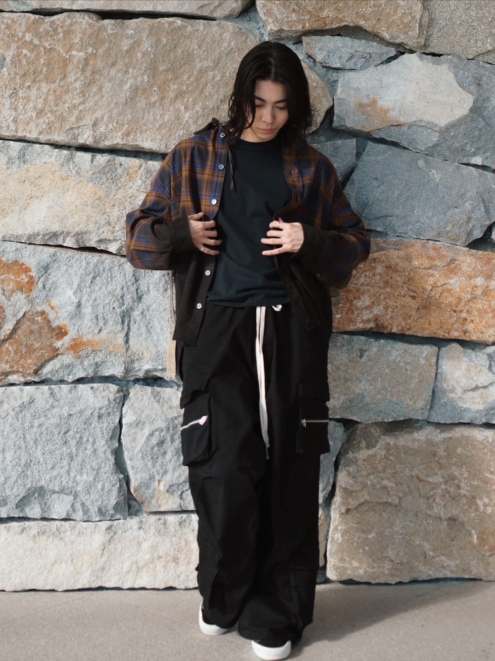 ワイドカーゴにオーバーサイズのチェックシャツでバランスの良いストリートコーデ。