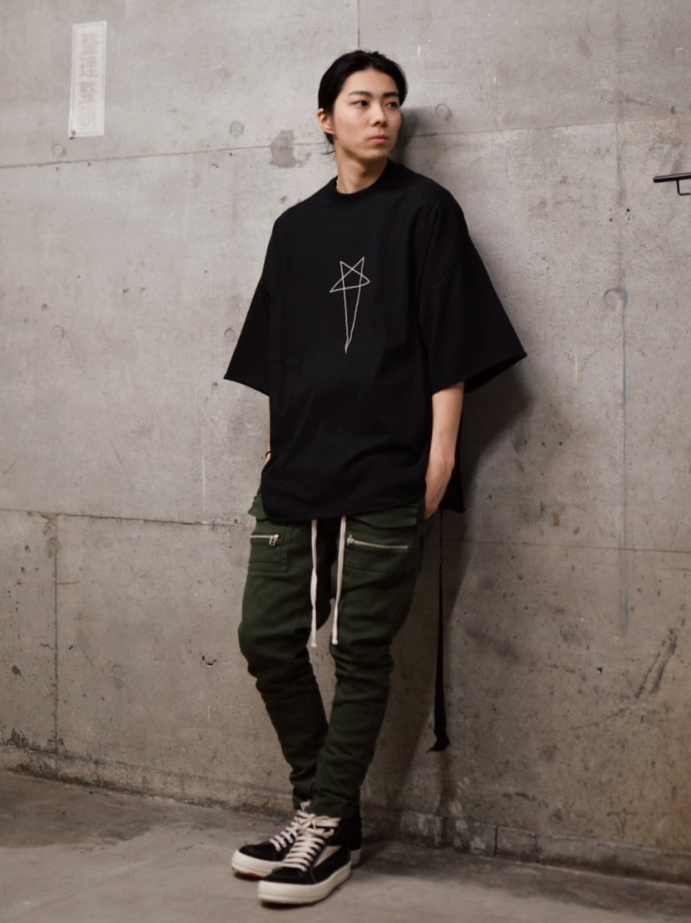 オーバーサイズのトップスにタイトなカーゴパンツ。懐かしさのあるモードなスタイリング。