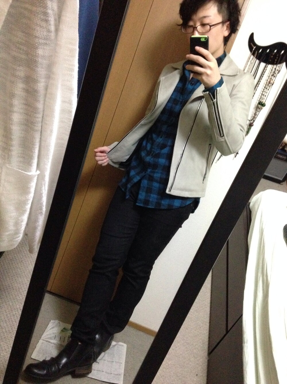 やっとレザーが着れる季節になりました♪ このレザーに合わせる為に買った仕事着兼普段着のユニクロのフランネルチェックシャツ。今年からのNEWカラーの青緑がライトグレーとの相性バツグンです!