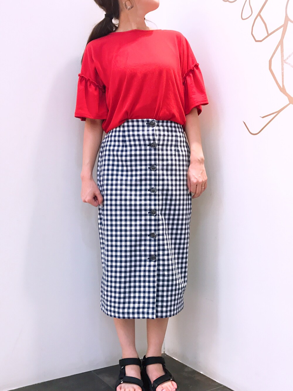 れーか(earth music&ecology)のスカート「・前ボタンギンガムチェックタイトスカート ○」を使ったコーディネート