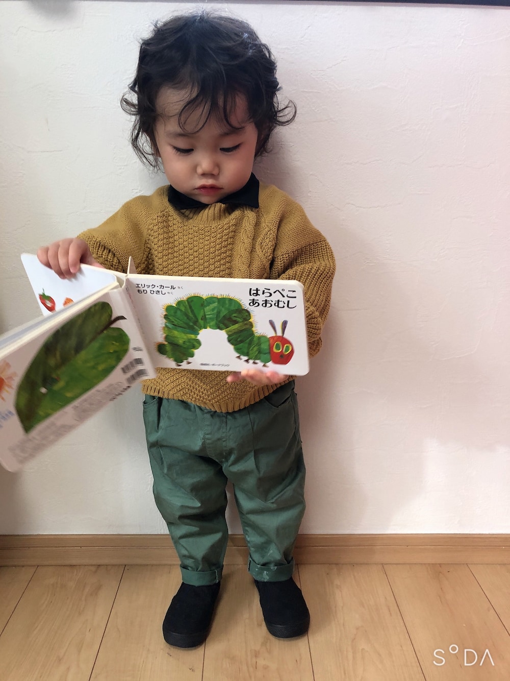 🏷グリーンフェス①③💚前夜祭 勝手に前夜祭開催します🙈💚 BREEZEさんのグリーンおパンツです🍏 紫も持ってるけどイロチ買いしちゃったやつ🙈サイズは90にしたので今年いい感じのゆるさで履けるように👏🏻 バターカラーニット🧈で落ち着いた色味にしました。 ブラックシャツをレイヤードしてちょい大人っぽくキッチリ風に✨ 大好きなはらぺこあおむしの絵本を自分で持ってきました🐛← お風呂入った後で髪の毛がくるんくるん😱 近々、切る予定ですが✂️ 今日はかぁちゃんも小僧もお休み。 なーにしようかな🤔