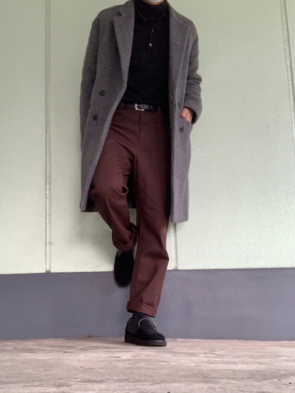 初登場のパンツです! この格好でドレスコードがスマートカジュアルのレストランに行きました! タックインすることでより大人っぽい印象に! 濃いめのブラウンって使いやすいですよね^^