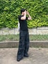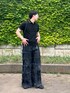 全身真っ黒だとキツイ印象になりがちなので、グレーのナップザックとヒラヒラが可愛いパンツで合わせました。