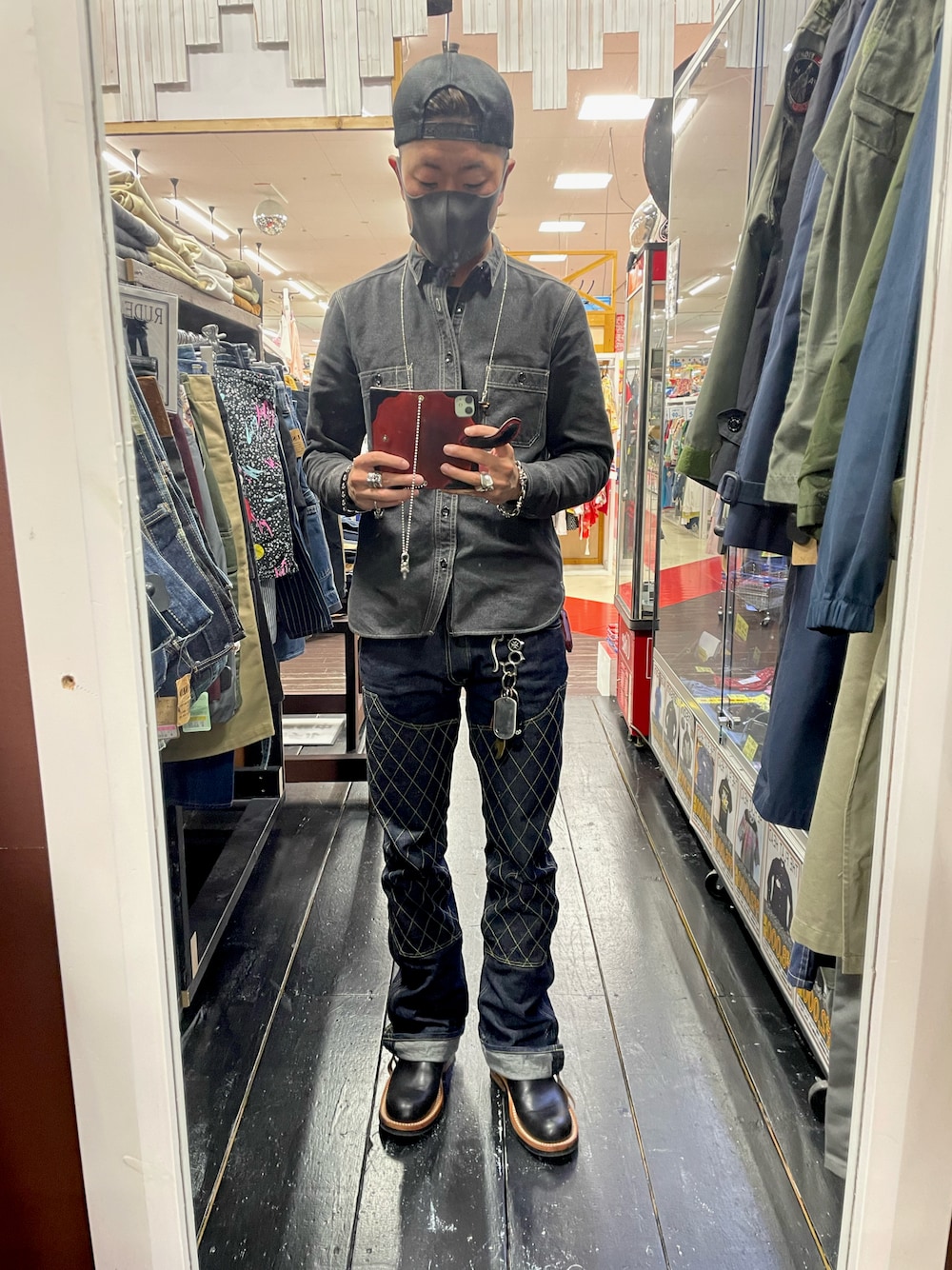 久しぶりの投稿です。 ダークトーンで合わせて無骨な雰囲気を演出してみたした。 ブーツカット仕様のデニムパンツのため足のラインがキレイに。