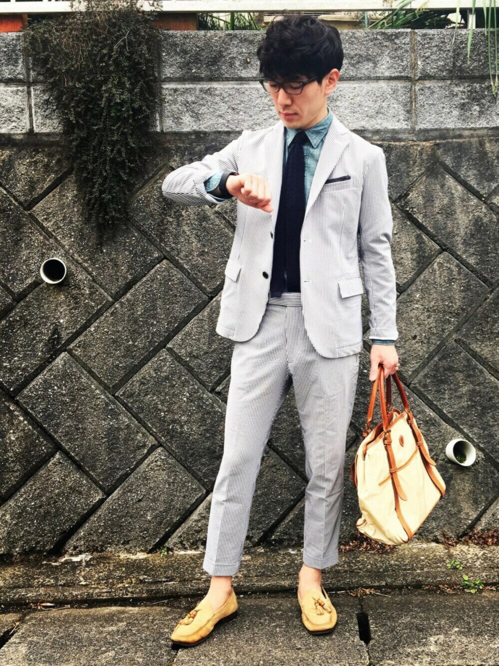 やっとシアサッカーのセットアップが着られる時期に! 夜は寒いからバッグの中にインナーダウンも持ってます。