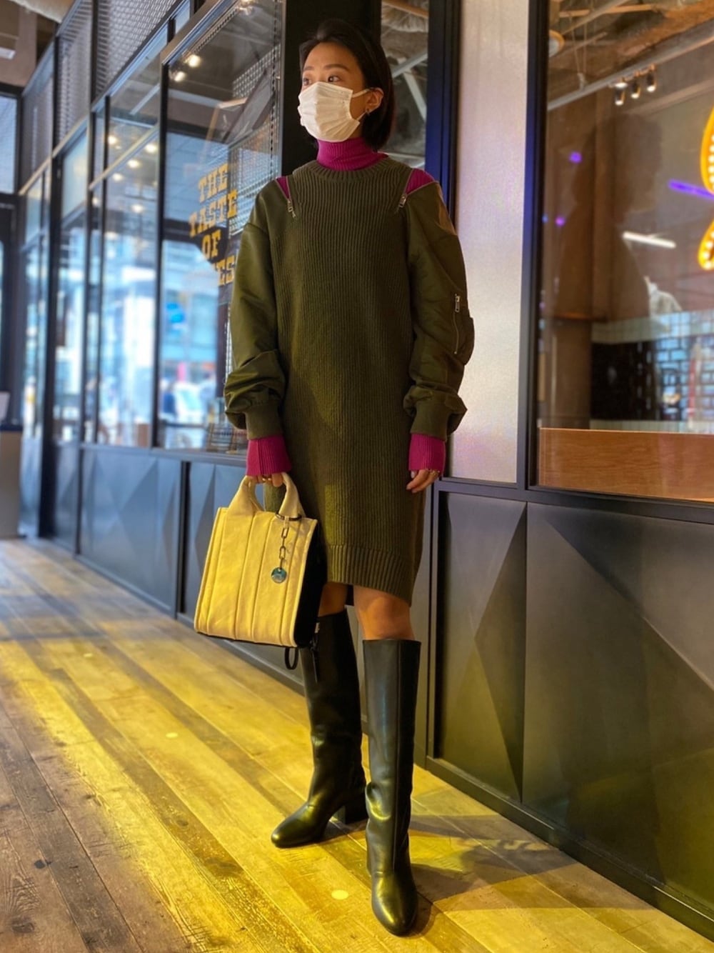 新作スタイリング💓 肩が開くワンピースはレイヤードでお洒落に!ロングブーツも今年の旬アイテムです🥰👢