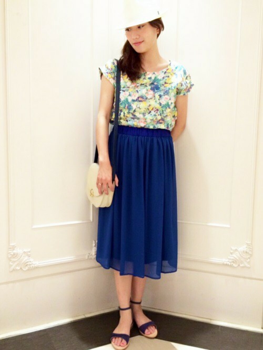 油絵のような華やかな柄のブラウスに、 鮮やかなブルーのロングスカートを合わせて、涼しげに。 真っ白な中折れハットで爽やかさをプラス。 足元はフラットサンダルでエレガントでも決め過ぎないコーディネートです。