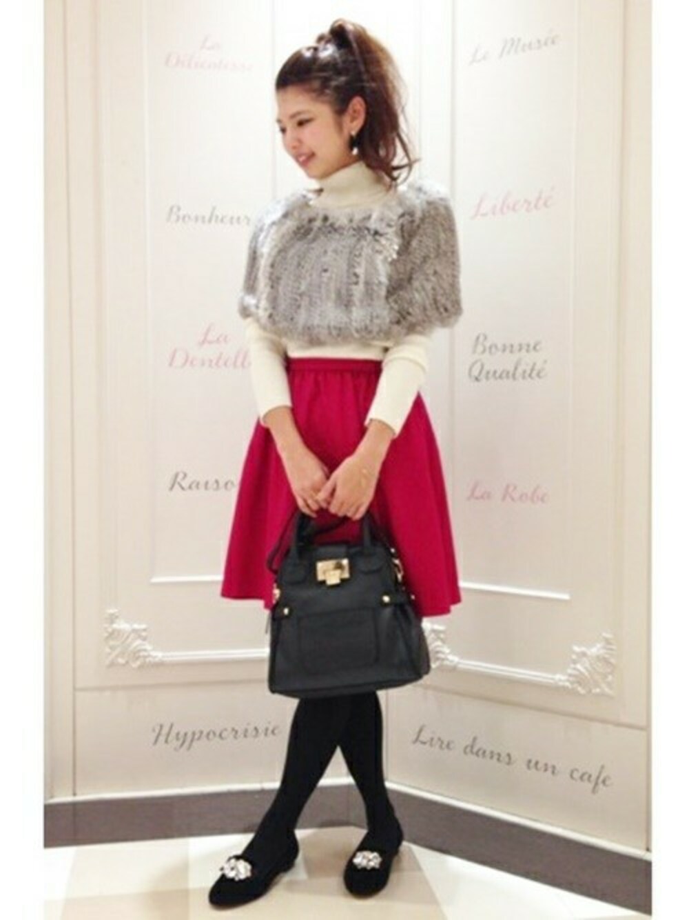 シンプルなタートルネックにカラーボトムを合わせた技ありコーデ。 少しレトロさと華やかさがあるスカートはオススメアイテムです☆