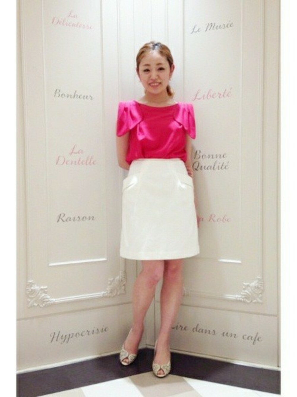 ピンク×ホワイトが 爽やかな印象のコーディネート。 肩の大きなリボンが フェミニンさを引き立たせてくれる ポイントです♪