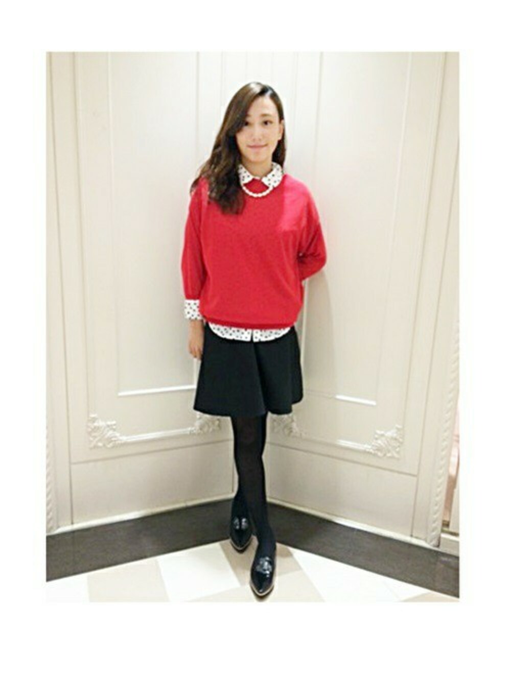 赤のニットとドットのブラウスでレトロに仕上げたこちらのコーディネートです。ニットの下に着用しているドットのブラウスは 季節感を問わずにお使い頂けるお素材です。定番のドット柄ですが、丸衿なので 一番上までボタンをしめてもきっちりしすぎずかわいらしい印象になりますよ。