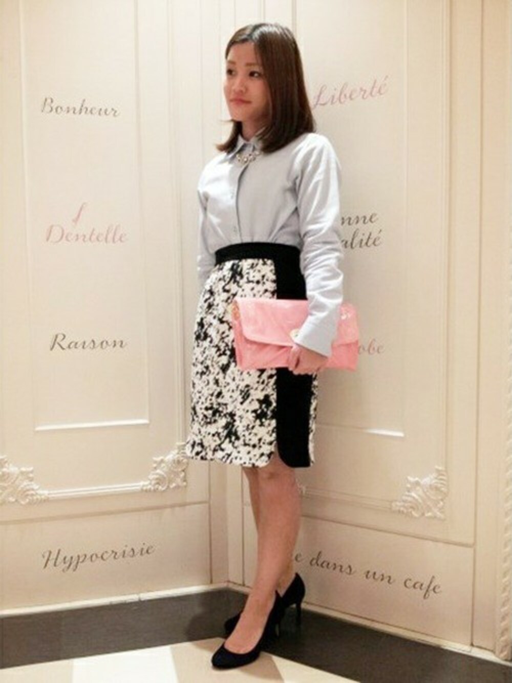 爽やかなサックスブルーのシャツには 大人色のモノトーンプリントスカートを合わせて エレガントさをアピールします。 小物で春色をプラスして先取りオシャレを楽しんで。