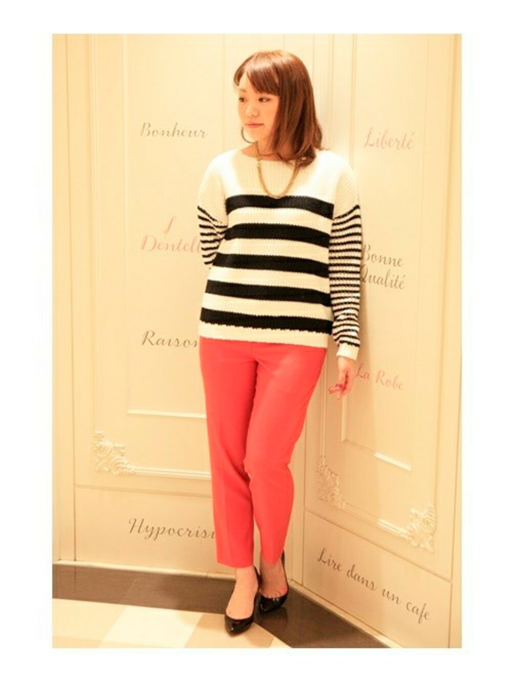 センタープレスでキチンと感のあるキレイパンツは トレンドのボーダーニットでカジュアルダウンが旬。 オフィスだけでなくデイリーにも使える優秀アイテムです。