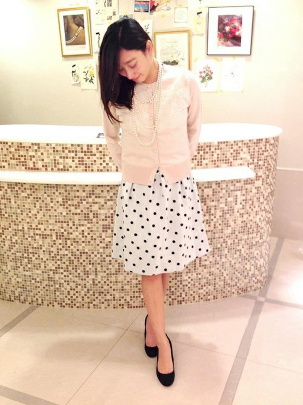 レース×ドット×パール。 淡い色味も相まってクラシカルな雰囲気のコーディネートです。