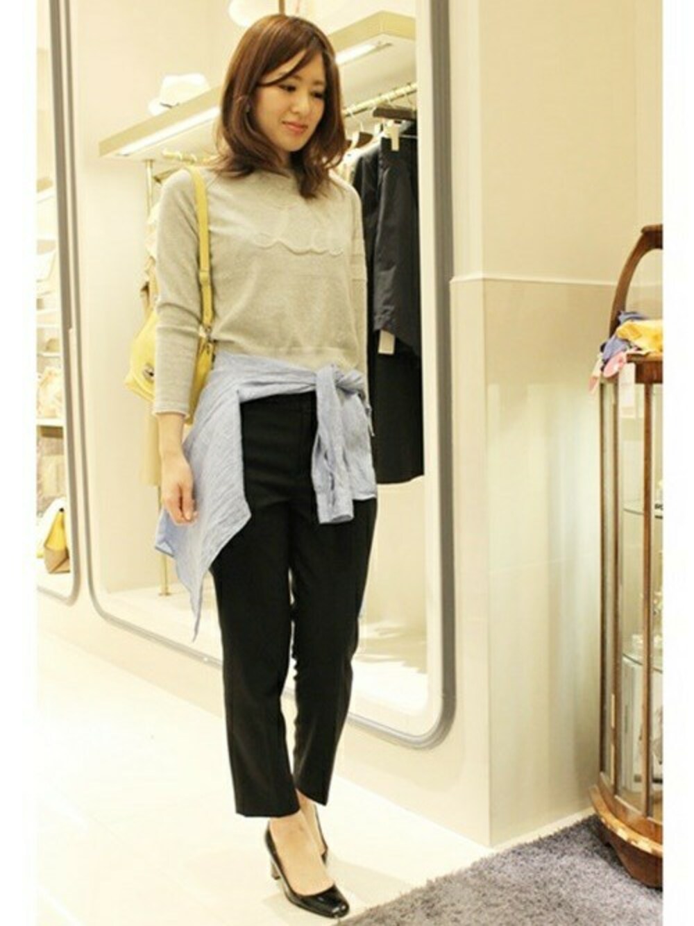 店でも大人気のロゴニットプルオーバー。 サックスブルーのシャツを腰巻きして とことんカジュアルな着こなしが今年らしくて◎。