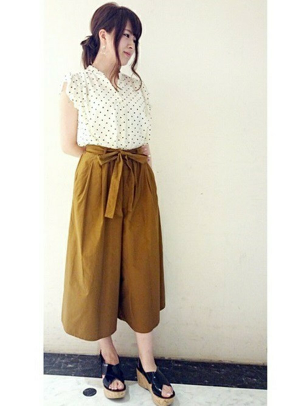 キャメル×ドットブラウス、ウエストにリボンでフェミニンさを出しました。 色味、シルエット共にトレンド感のあるコーディネートです。