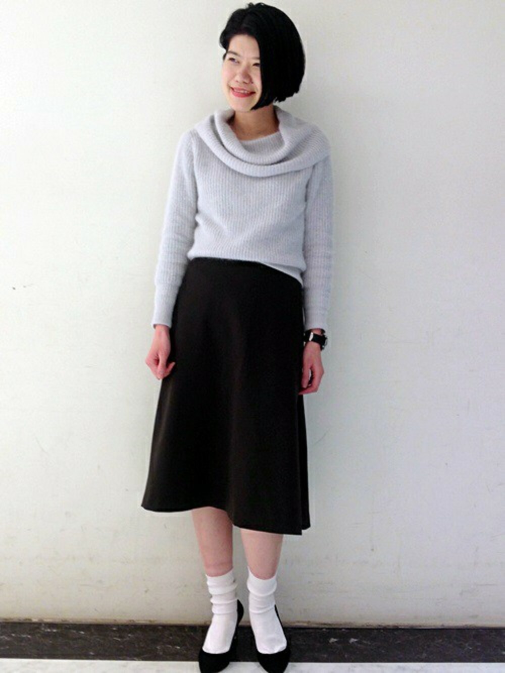 アンゴラの柔らかい雰囲気にロングスカートを合わせてエレガントなコーディネートにしました