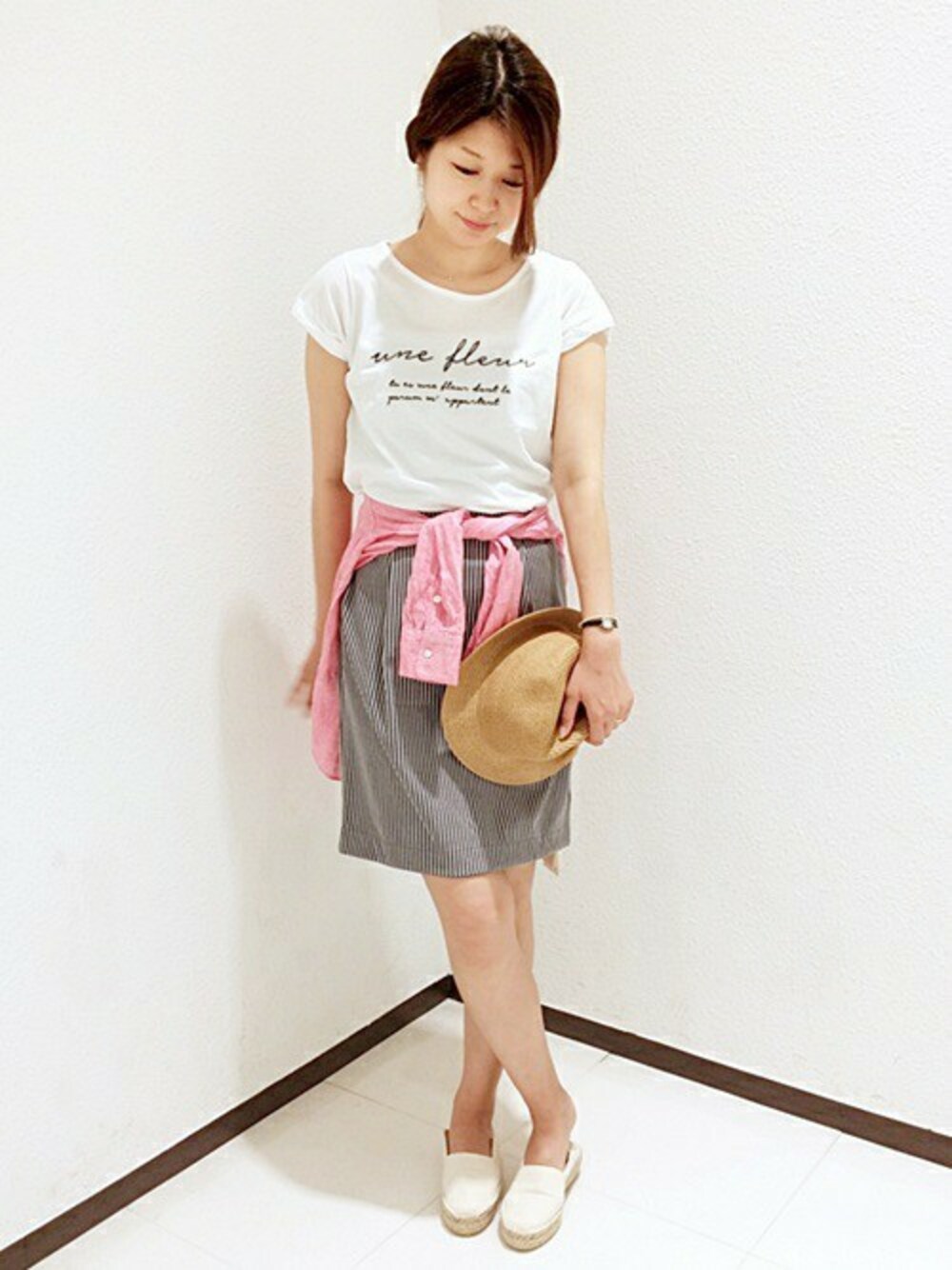 細めのボーダーがポイントのスカート!カジュアルにTシャツ合わせでお出かけコーディネート☆ 梅雨に入りお天気も安定していませんが、サンダルにストローハットで思いっきり休日を満喫したいですね。 無地とストライプの2Wayで着回し可能です☆