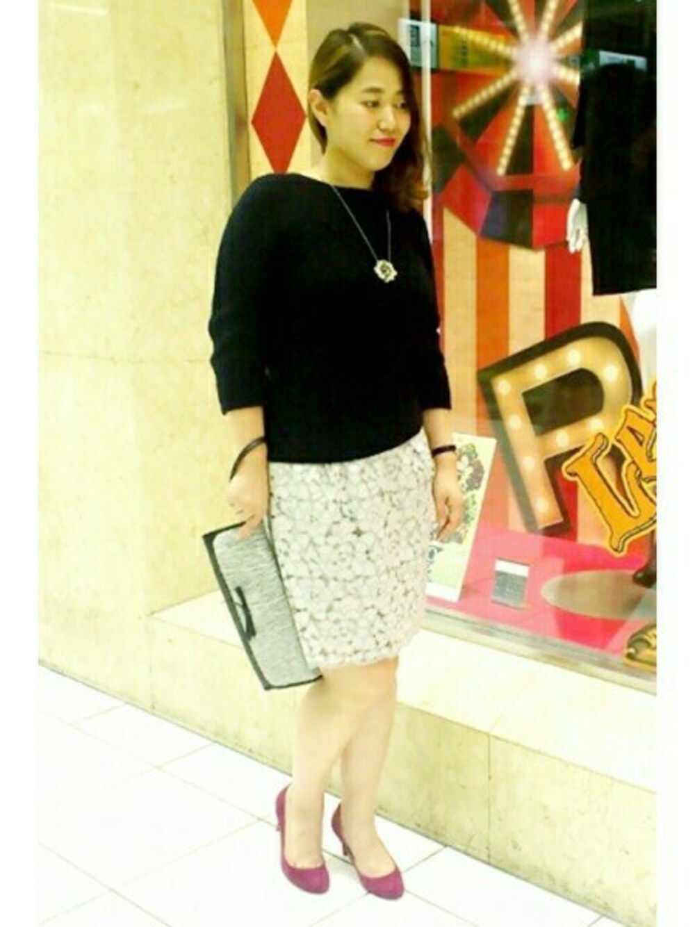 アゼ編みでシンプルでもざっくりとした編み地が とってもフェミニンなニットです。 横方向の編み地で伸縮性が大きいのも特徴♪ 総レースのスカートはタイトシルエットが 女らしをアップさせてくれるポイント。