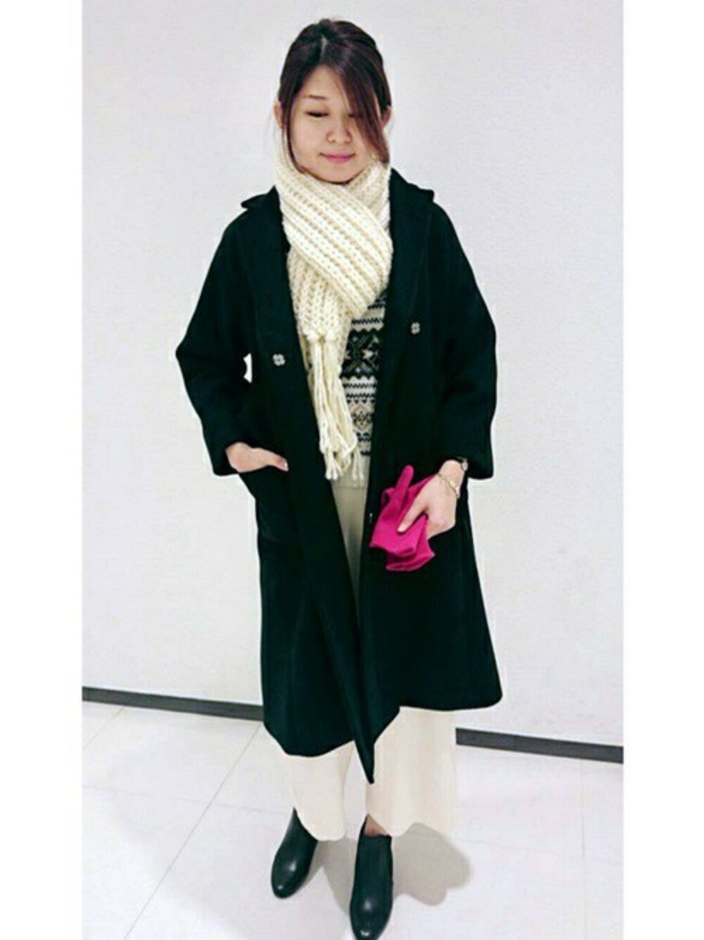 エレガントな印象のガウンコートも、合わせ方でカジュアルな印象にチェンジ。 iliann loebのフェアアイル柄のニットをワイドパンツで合わせました。手元はあえて目の引くレッドのグローブをチョイス!モノトーンな色合わせのポイントになってくれます。