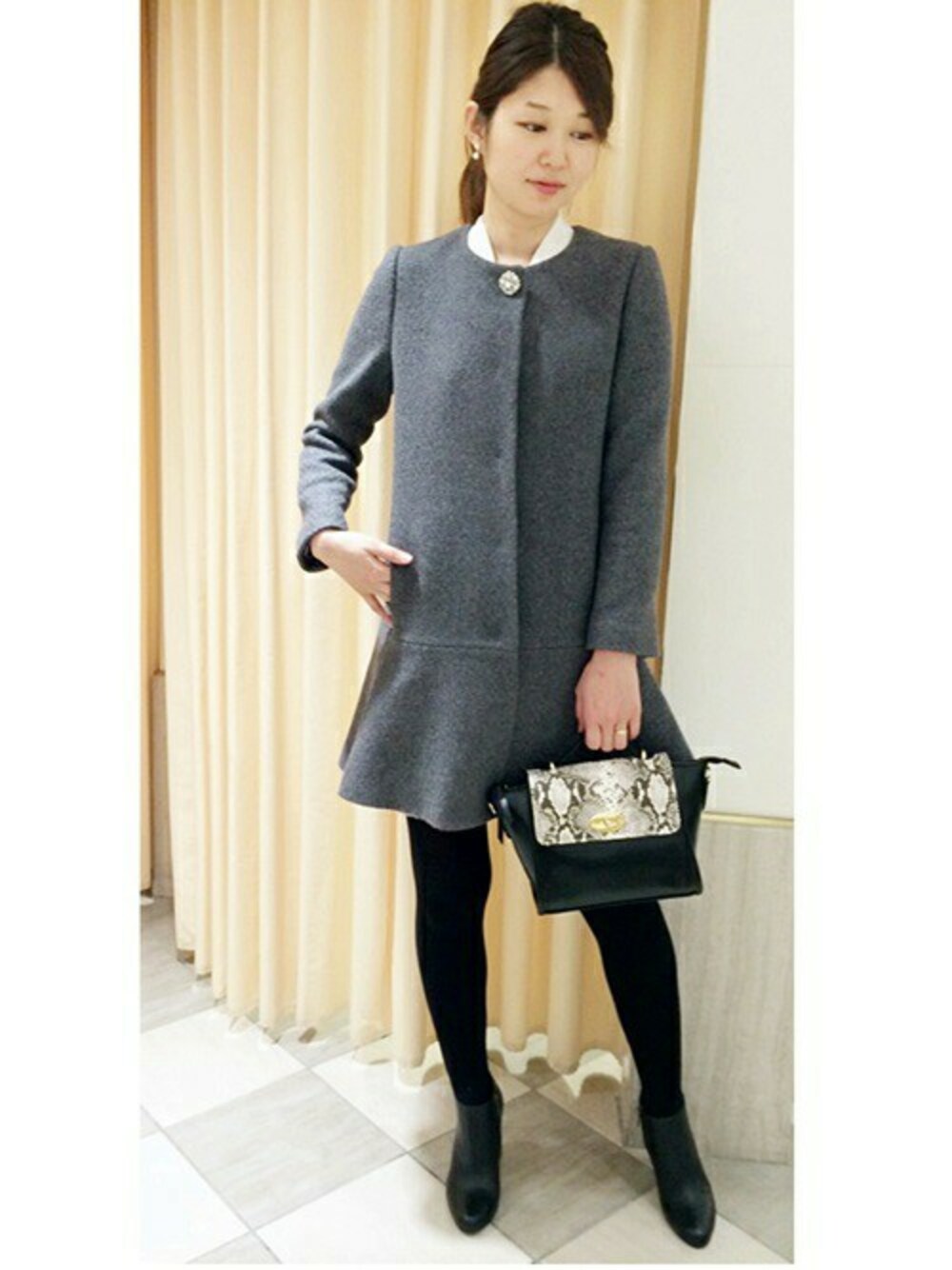 フレアーの可愛いコートに辛口パイソン柄のバッグで、大人のコーディネート。可愛らしさも抑えられたスタイリングです。