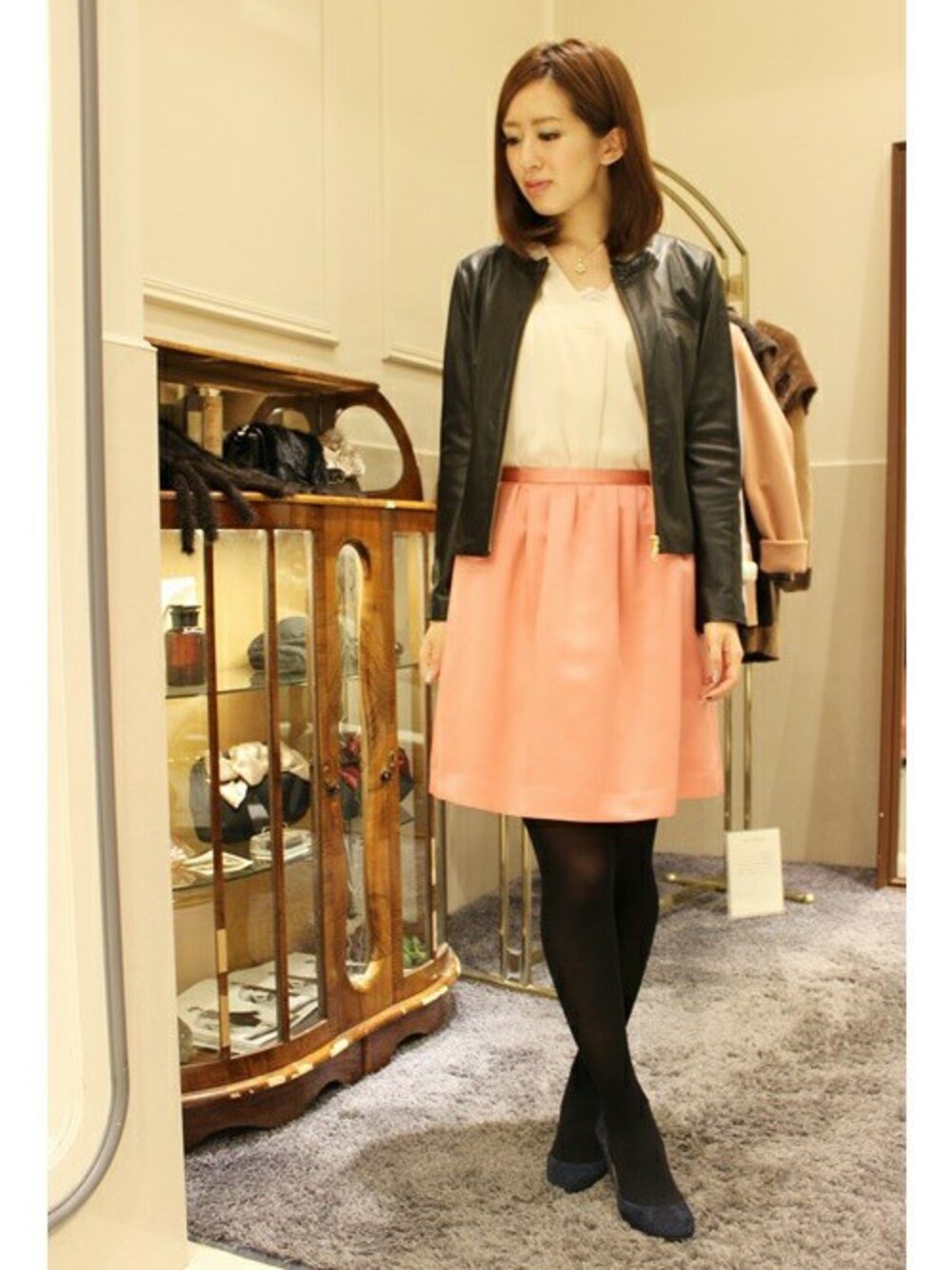 メンズライクになりがちなライダースジャケットは 女性らしいピンクのスカートでエレガントな着こなしに。 ブラウスと合わせてオフィス使いにもぴったりな スカートです。
