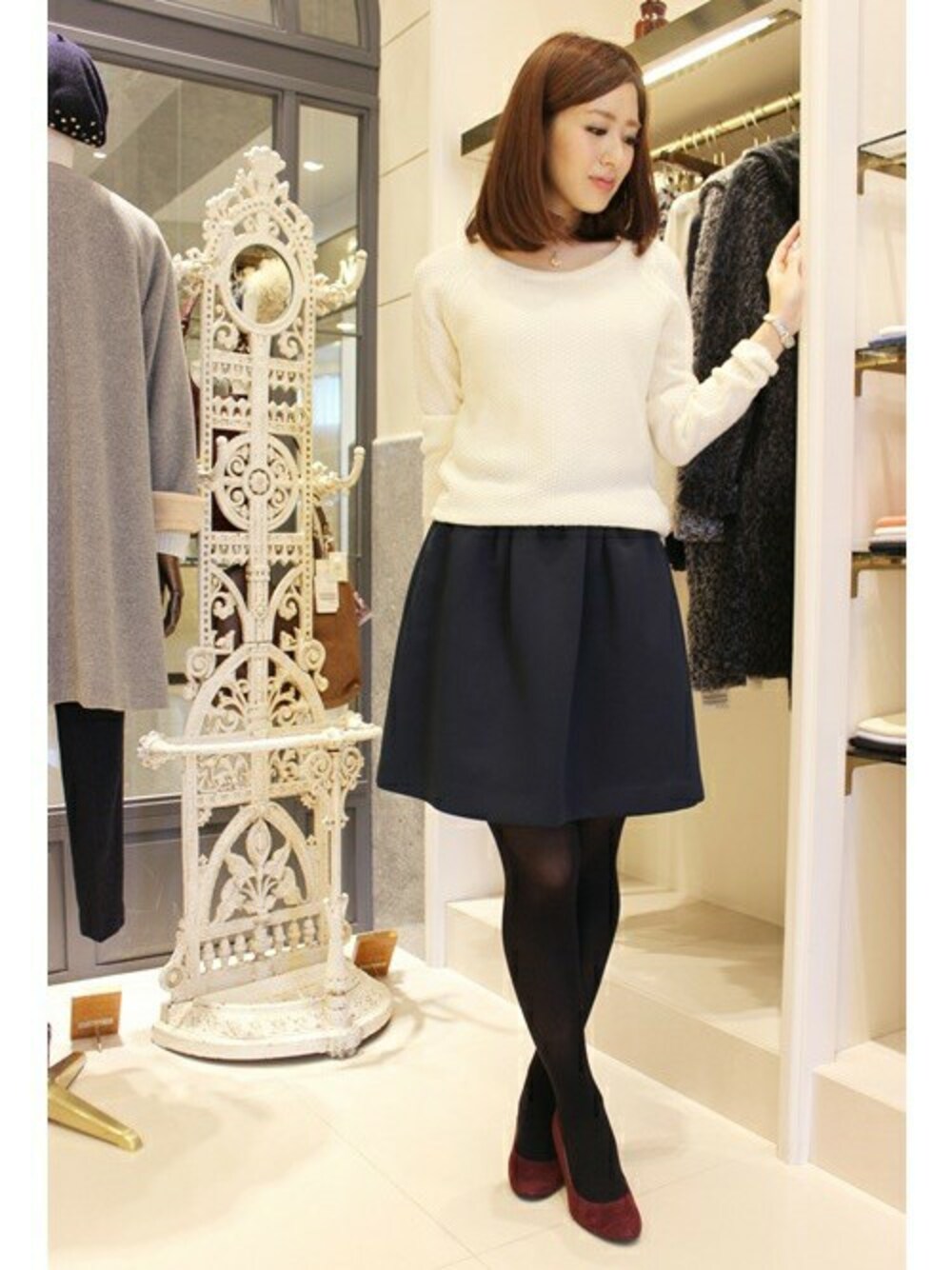 キレイ素材のスカートはカジュアルなニットをオンして デイリーオシャレを楽しんで。 ベーシックなカラーリングで着回しの幅が広がるのも 嬉しいポイント。