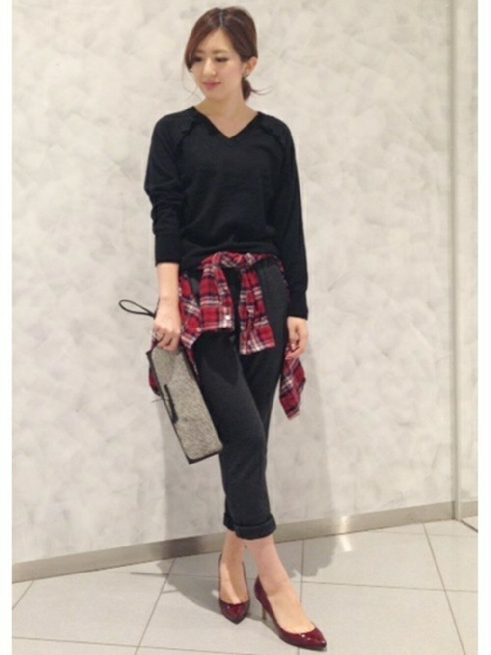 ニットは、ショルダー部分のフリル使いがロマンテックなプルオーバー。 女性らしいネックラインをアピールしてくれる Vネックで大人の印象を演出してくれるので、 カジュアルめのスエットパンツもすっきりと見せてくれます。