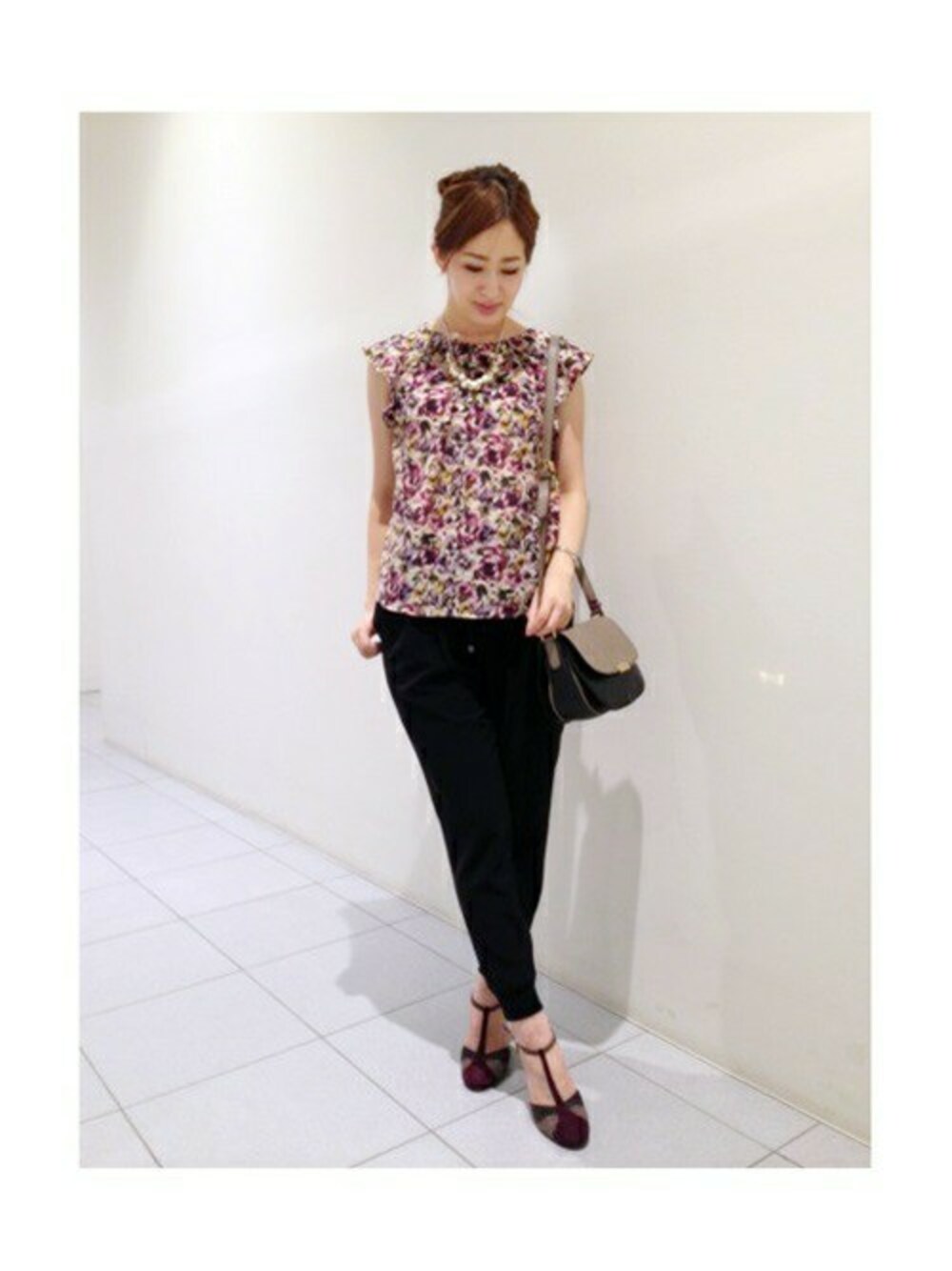 とろみのあるギャザーイージーパンツに花柄ブラウスを合わせて、フェミニンとスタイリッシュのミックススタイル 。 足元はヒールで女性らしい細さをだしております。