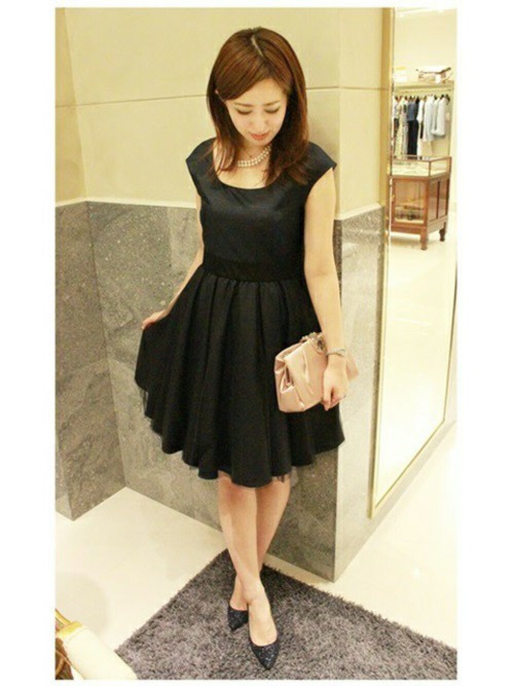 定番のドレスは、スカートの中にチュールペチコートがついているので、ふんわりしたきれいなラインが特徴です。 少し肩にかかるフレンチスリーブが、ストールやボレロ無しでもお使いいただける安心感もあり、さすが定番ドレス! グリッターパンプスが、いつもとは違ったパーティードレスにしてくれそうです!