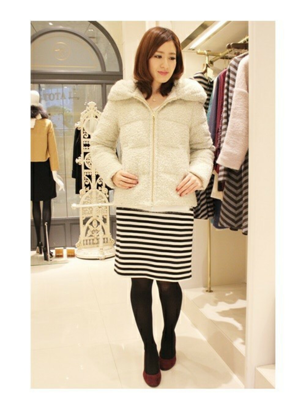 大人気のボーダータイトスカートとの相性も抜群なショートダウン。 キレイめにもカジュアルにも使える着丈が嬉しいポイント。
