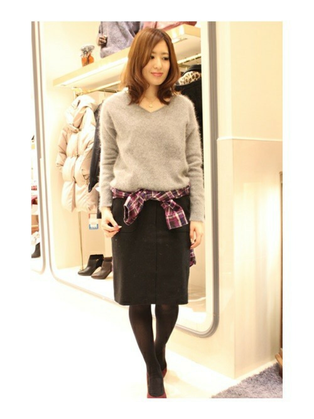 シックになりがちな冬コーデには、チェック柄のシャツを腰に巻いて、 ポイントを作って。エレガント見えしすぎる ベーシックカラーのタイトスカートは上手にカジュアルダウンが◎