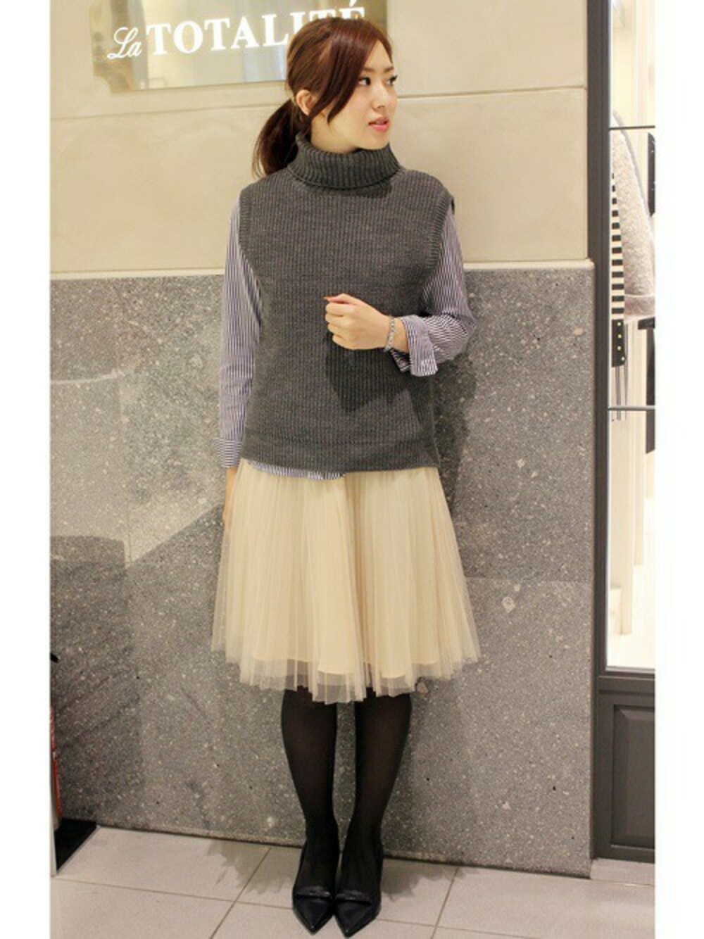 注目のノースリーブニットに、チュールレースのスカートとシャツで、ミックススタイリングです。メンズライクなシューズを合わせても可愛いですね。