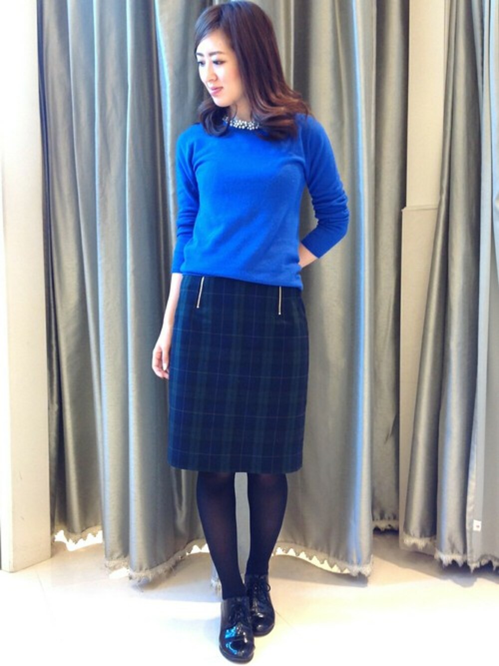 パールの華やかなプルオーバー。ハイゲージでスッキリとしたシルエットなのでインでもアウトでもお使いいただけます★今年大人気のチェックのスカートはダブルzipがポイントです。