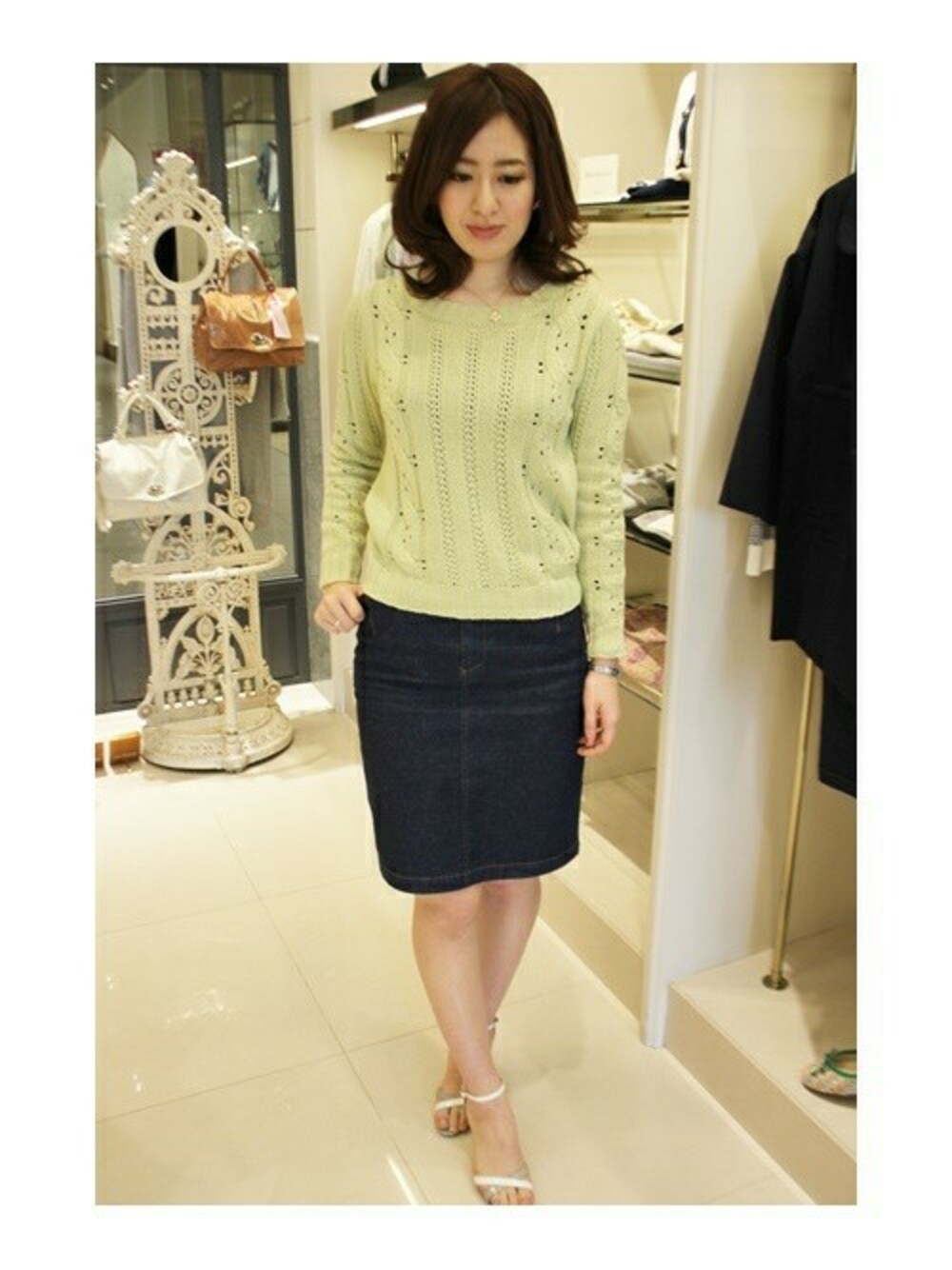 品の良いケーブルニットは、トレンドのデニムタイトスカートで 今年らしいカジュアルスタイルで着こなして。 爽やかなグリーンが、いつものコーディネートを 更に爽やかに春らしく導きます。