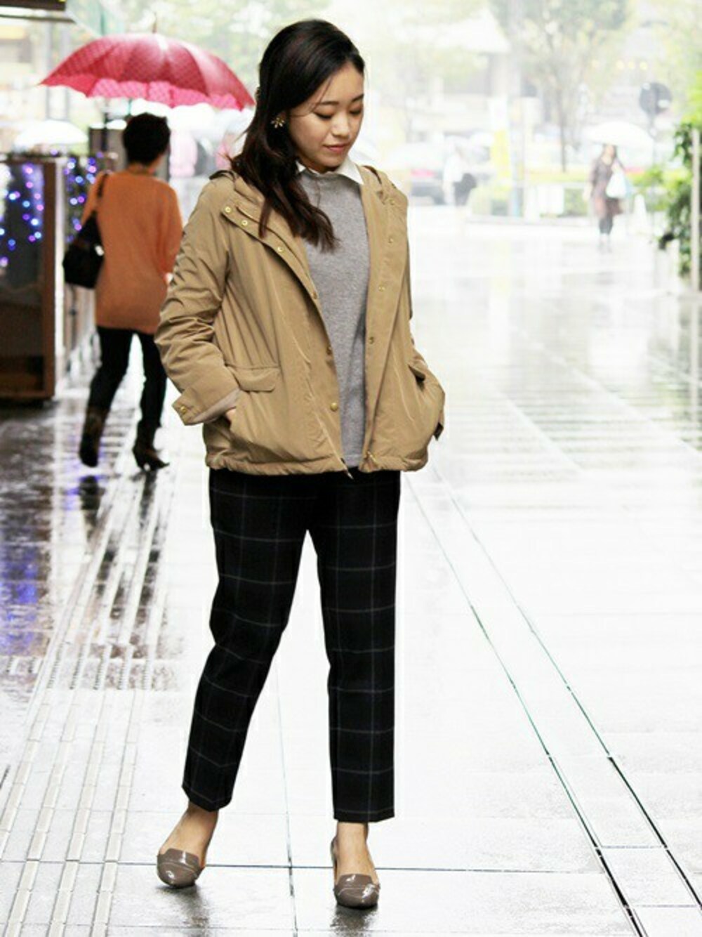 カジュアルなアウターとパンツは、きれいめのパンプスをあわせて。