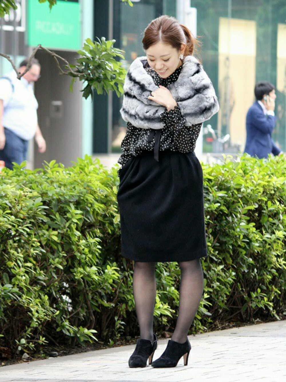 ベーシックでどんなものとも相性のよいスカートは、シックにドットブラウスと合わせました。今年らしいファーがアクセントになっています。