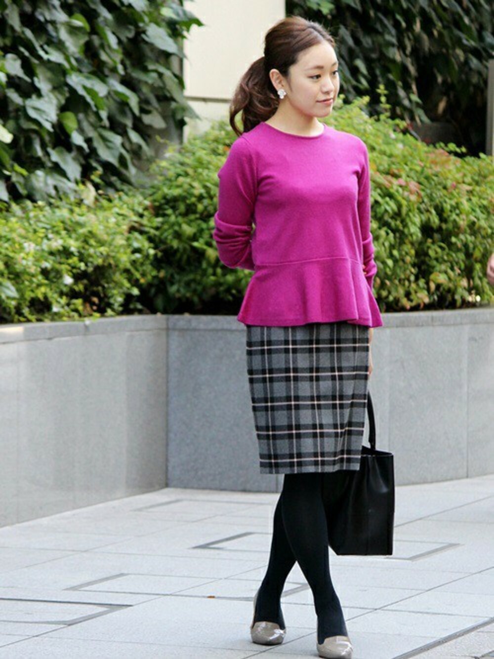 女性らしいペプラムニットは、腰回りのすっきりとしたタイトスカートをあわせて、ラインをきれいに見せました。