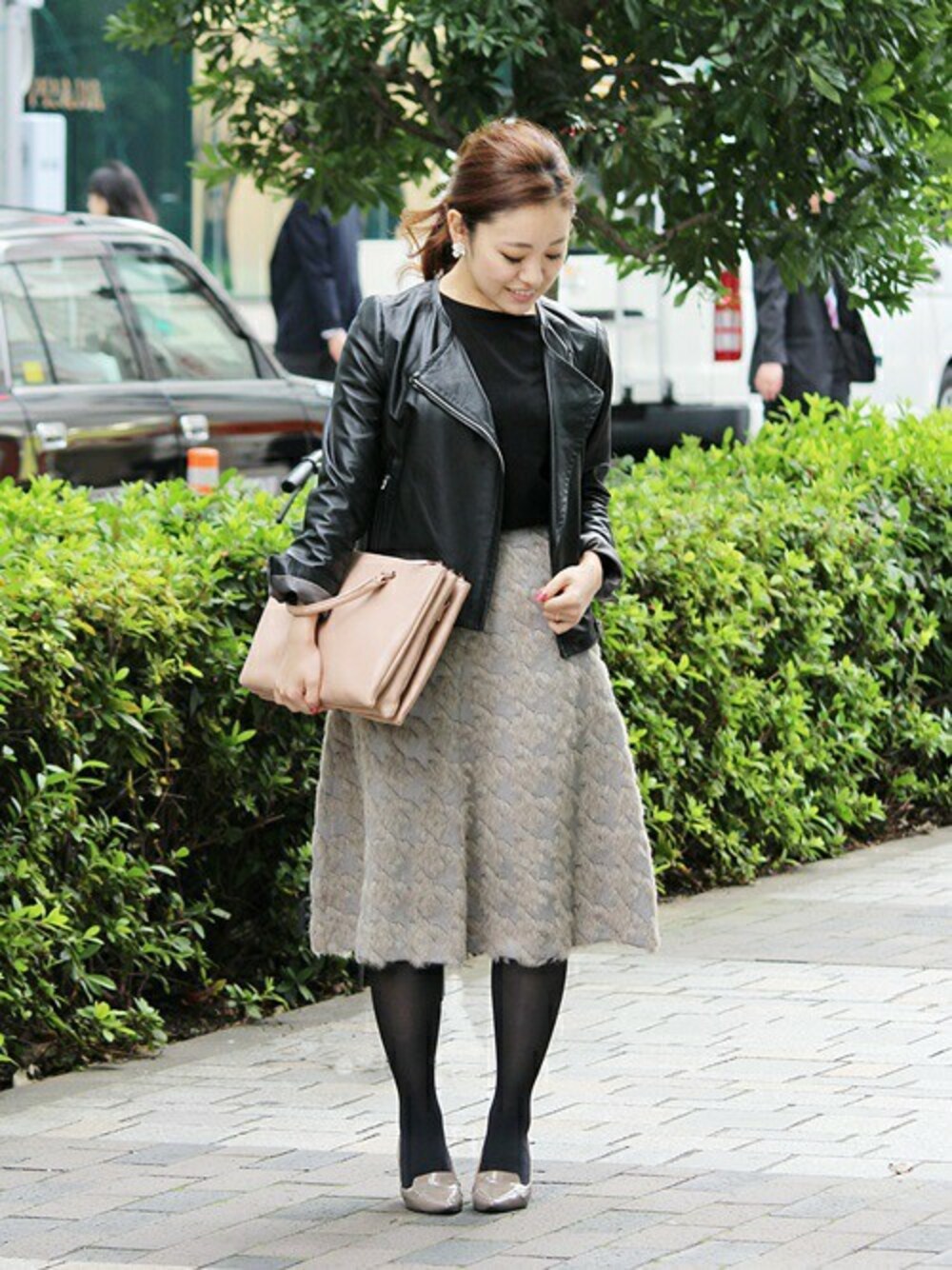レザーのジャケットにシャギーのスカートを合わせて、辛目だけど女性らしいコーディネート。 インナーは、袖がフレアになって、アウターを脱いでも可愛い仕様です。