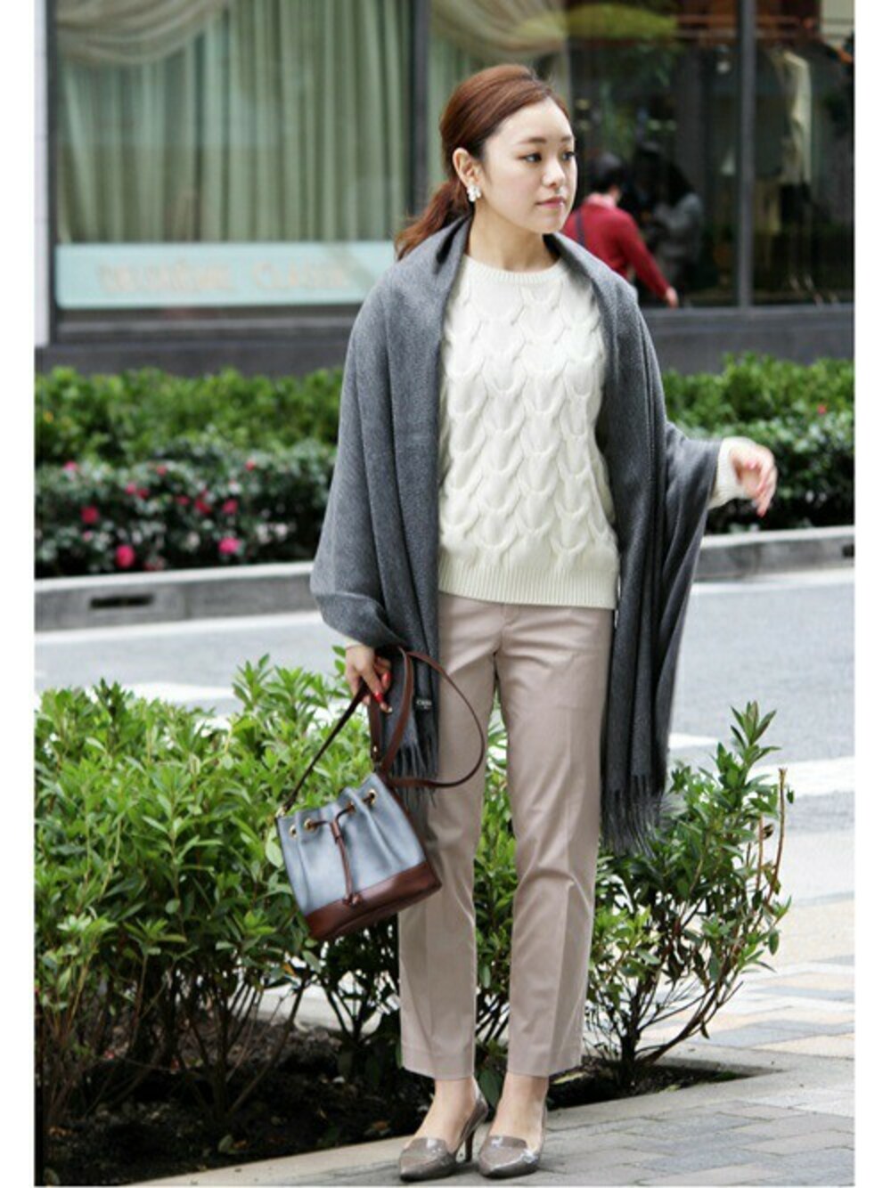 ベーシックでラインのきれいなパンツは、カジュアルなケーブルニットを合わせてもきれい。 オフの日に着たいシンプルコーデ。