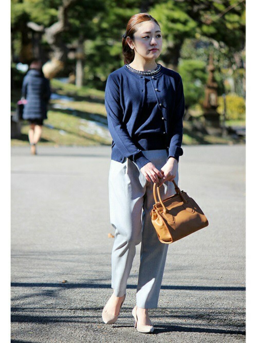 お顔周りの華やかなニットには、シンプルなタックパンツを合わせてオフィスでもお使いいただけるコーディネート