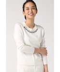 大ぶりのビジューでコーディネートが華やか印象になります。 忙しい朝などにアクセサリーを選ばなくて良いのも嬉しいポイントですね。 薄手のお素材ですので、アウターのインにいれて頂いても、ひびかず綺麗にお召いただけますよ。