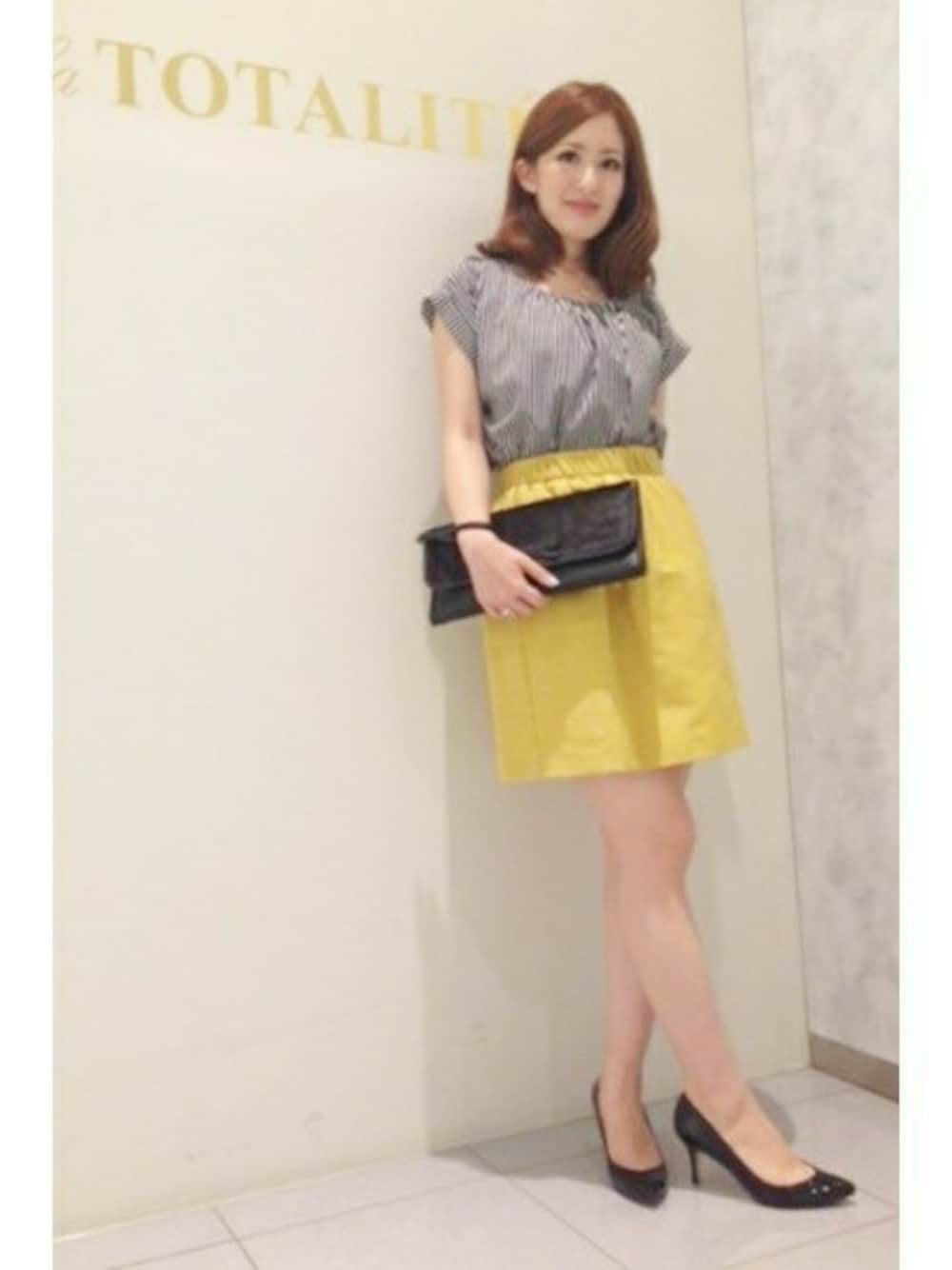 ボーダーとストライプの2WAYで 着ていただけるブラウスは ストライプの面でシックな印象で。 目を引く、イエローのスカートは 落ち着きのあるトーンで 一気に空きらしいコーディネートです。