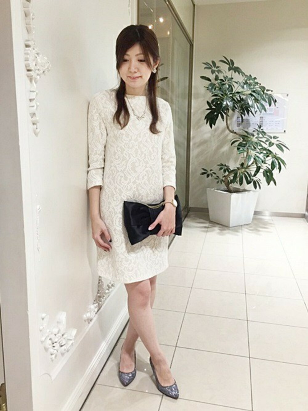 レース使いが素敵な、秋冬仕様のボンディングワンピースを使ったコーディネートです。 レース使いが得意なLaTOTALITEならではの華やかなワンピースです。 寒くなってきたこの季節でも、一枚で温かくお洒落に着て頂けます。