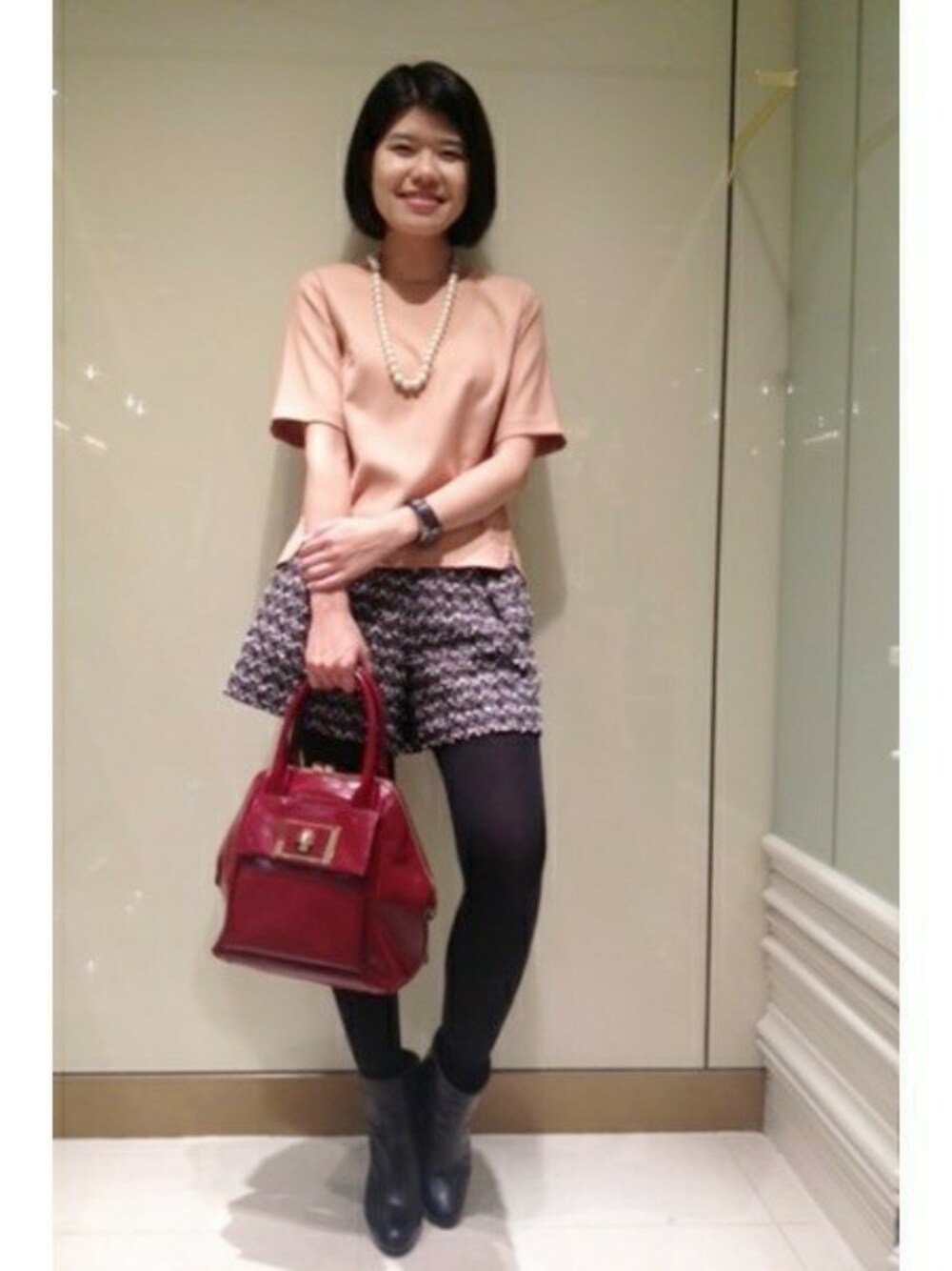 ブラウスはTシャツ型で、今年トレンドのアイテムで着易く、色味も鮮やかです。 ショートパンツはツイード素材で、風合いは秋らしく、 ですが程好く色味もプラスされているので重たくなりません! 今回はタイツを合わせましたが、まだ暑い!という方には 素肌にショートブーツの組合せをオススメします☆