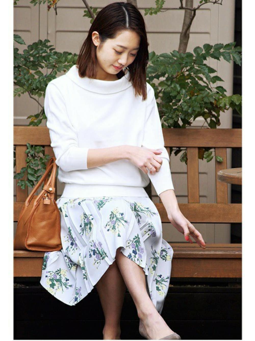 デザインのあるニットは春らしい花柄プリントスカートを合わせて、明るい清潔なコーディネートです。デニムなどのアイテムをプラスしても可愛いですね。