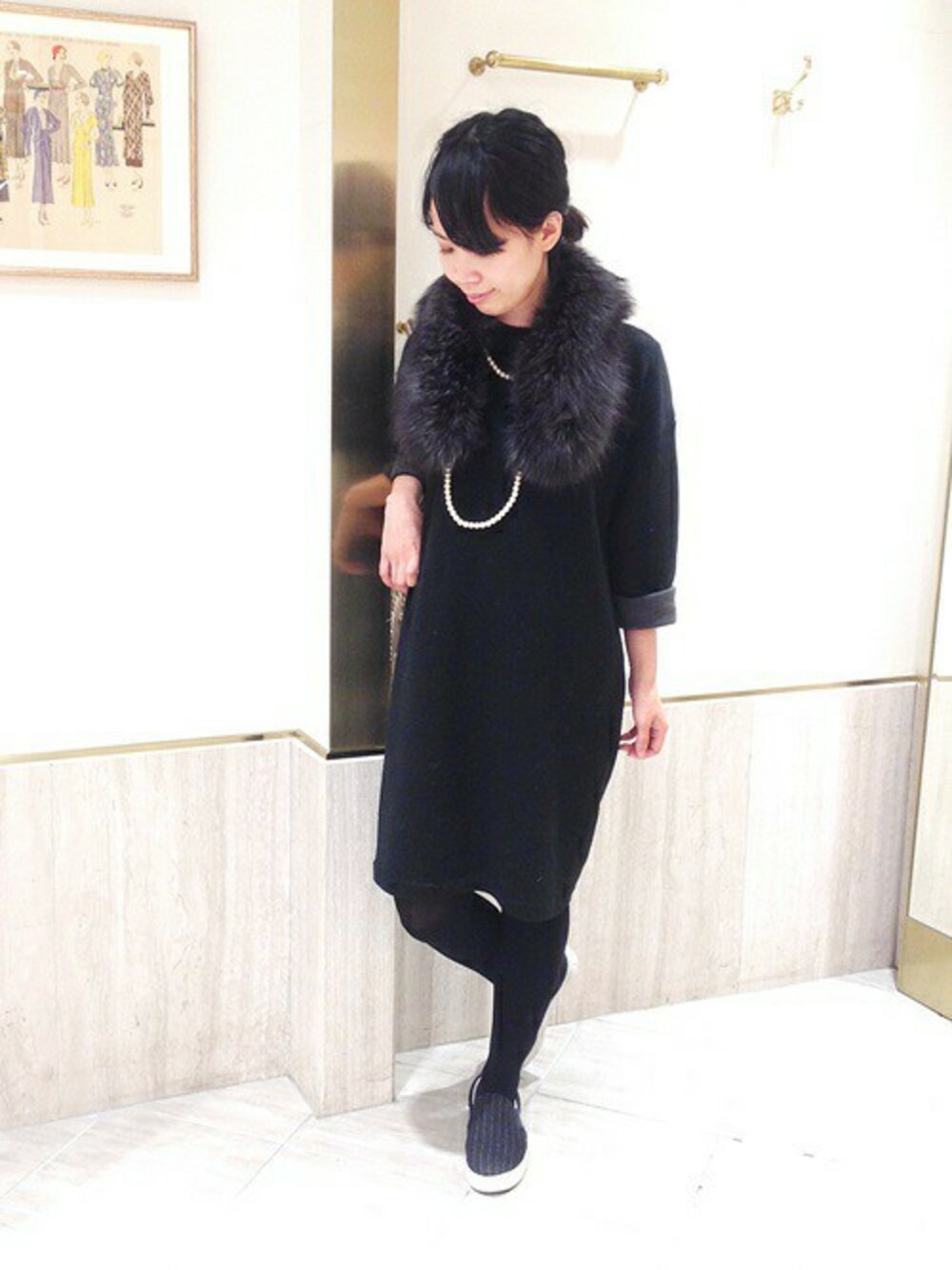 カジュアル見えするワンピースにパールネックレスを合わせて、ミックスコーディネート。スリッポンなどもアクセントになりますね。
