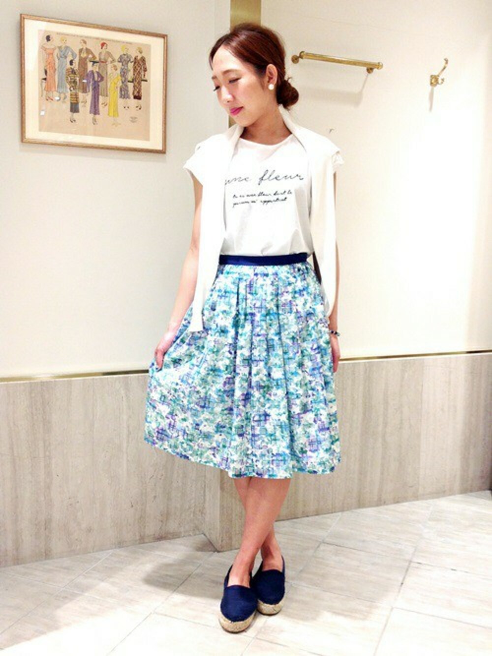 白×ブルーでこれからの季節にぴったりな涼しげなコーディネート。 トップスをインにしてコンパクトにまとめると、バランス良くスタイリングができます。