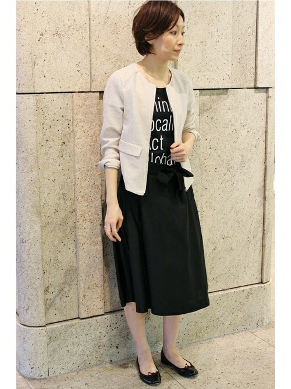 リボンスカート 女性らしいリボンスカート。 プリントTもブラックで揃えて、大人なスカートスタイルの完成!
