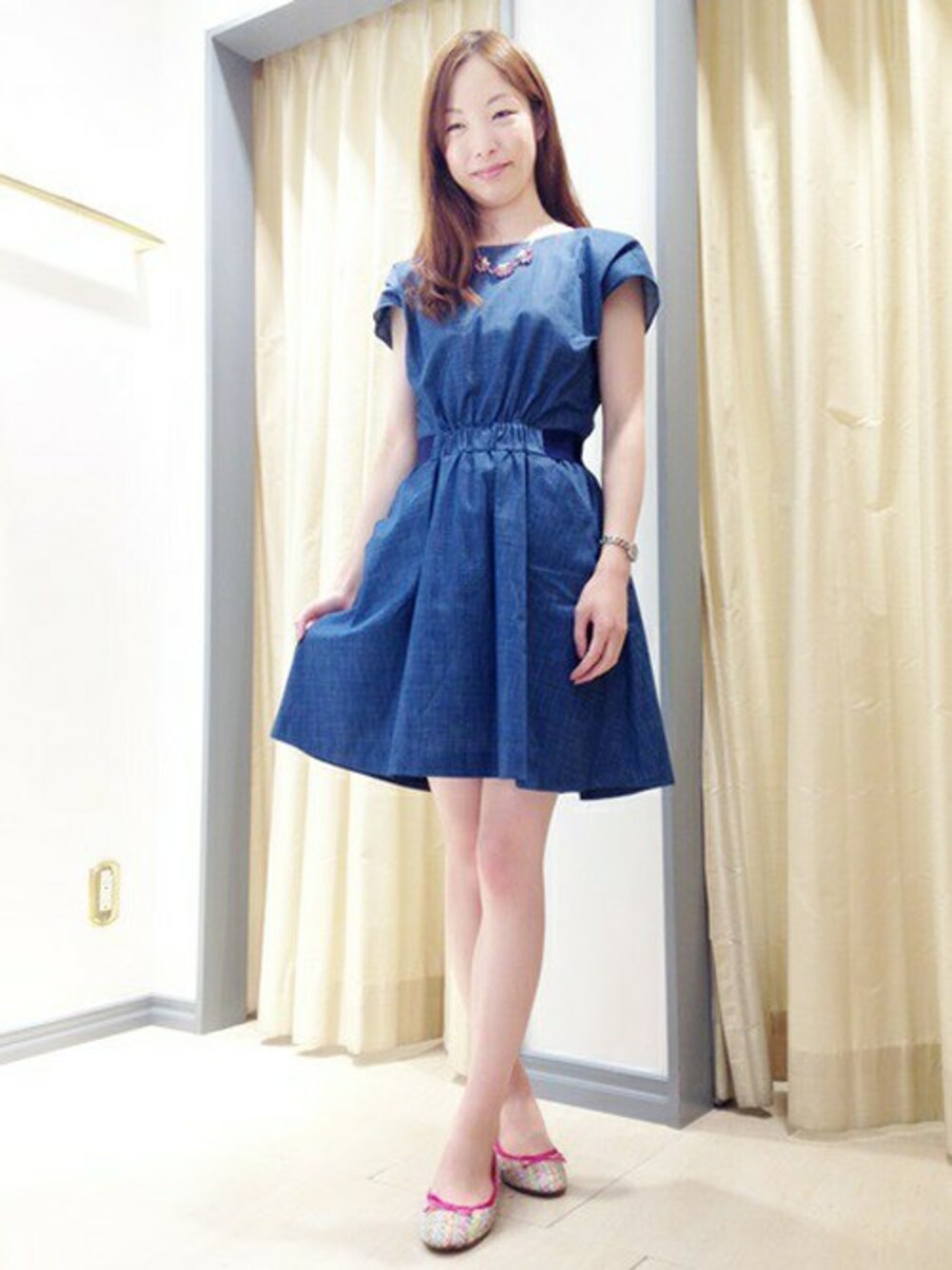 胸元のラインが美しく、デニムなのにフェミニンな印象のワンピです。カジュアル感が強い素材を、こんなにも柔らかい印象にしてくれる、ブランドならではの技。